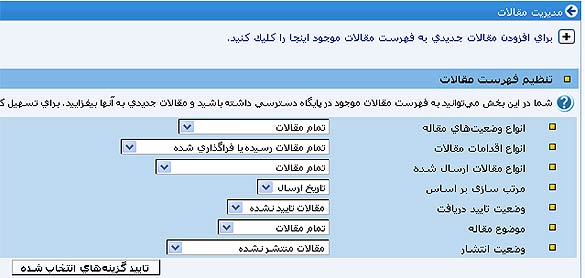 در این صفحه به فهرست مقالات منتشر نشده در پایگاه دسترسی مییابید. شما میتوانید مقالات را به شیوههای مختلفی دستهبندی کنید. برپایهی: وضعیت مقاله، اقدامات انجام شده روی مقاله، تاریخ ارسال، موضوع مقاله یا وضعیت انتشار. از همین صفحه میتوانید مقالهی جدید نیز به برنامه وارد کنید.